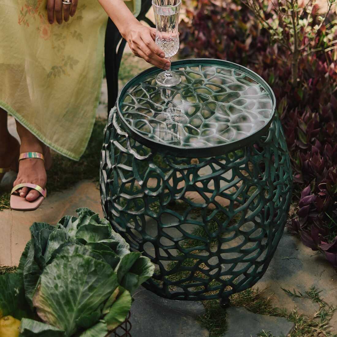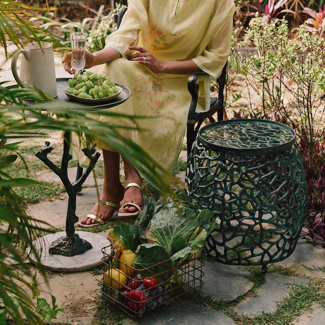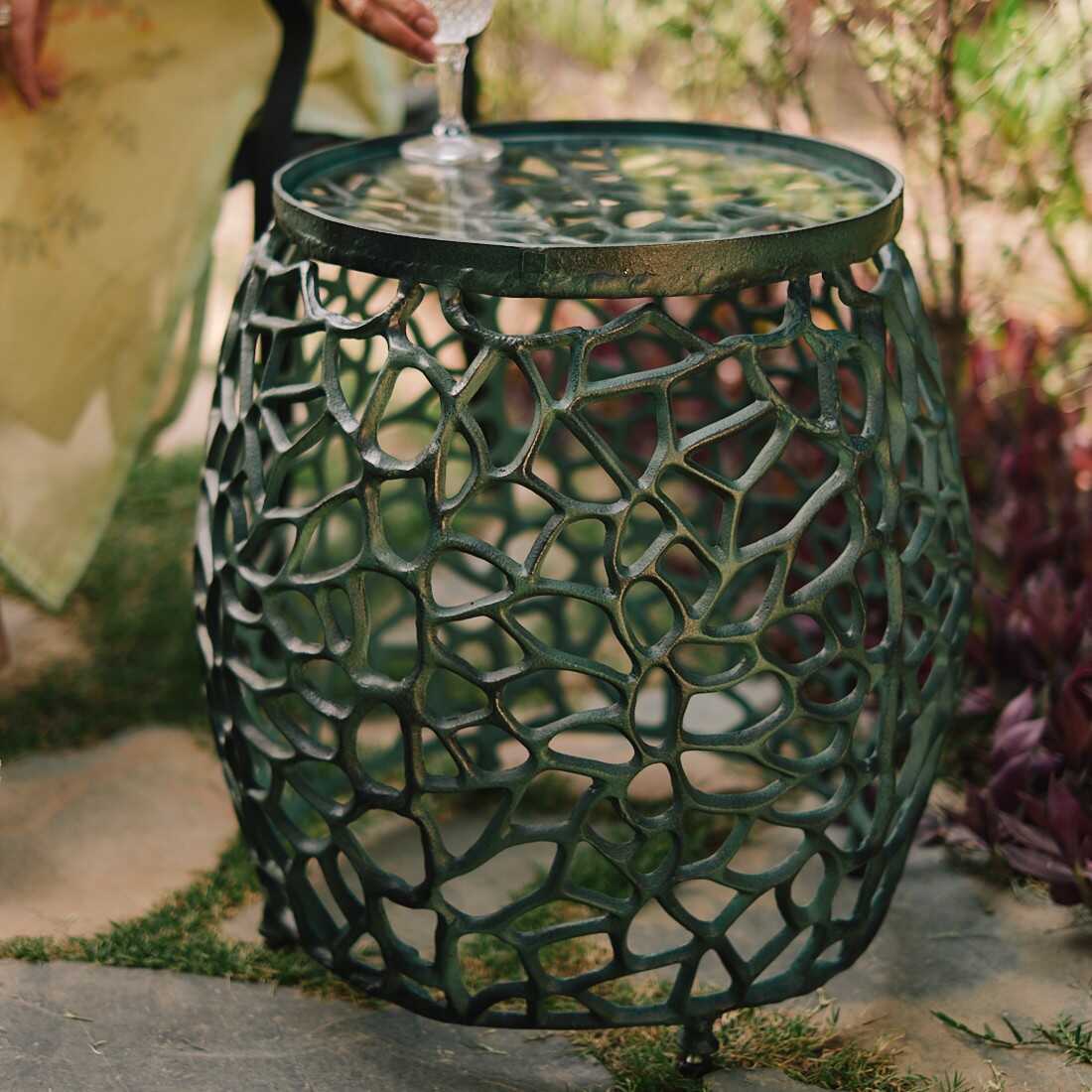 The Aaval side table is inspired by a canopy of branches. The feeling of sitting under a tree, and watching the sunlight seep through the interlocked branches.