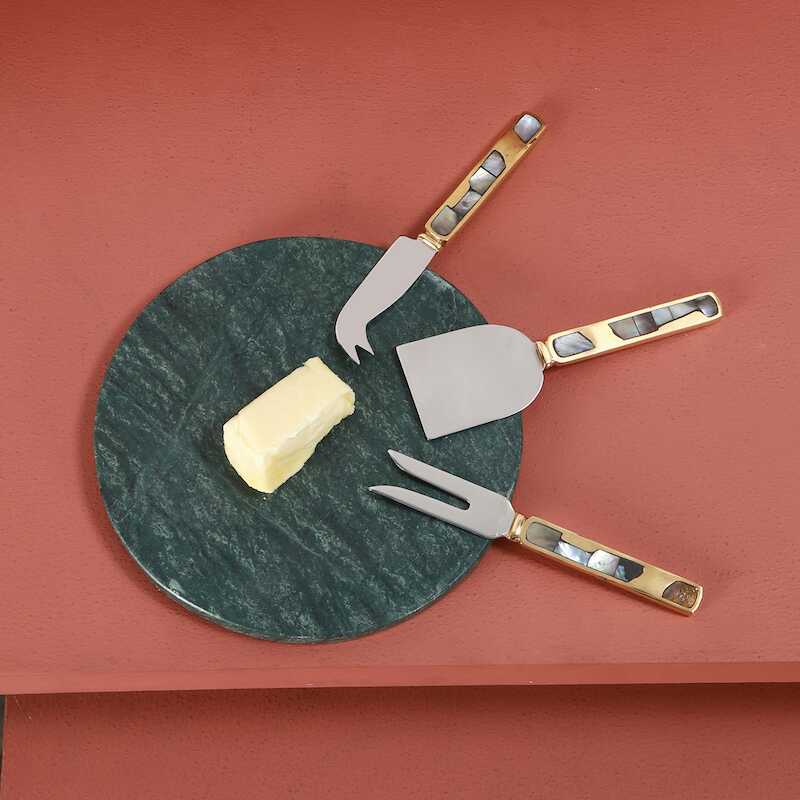 Host in style with these gorgeous cheese knives. Set with mother of pearl, these beauties are a keepsake in your serve ware collection.