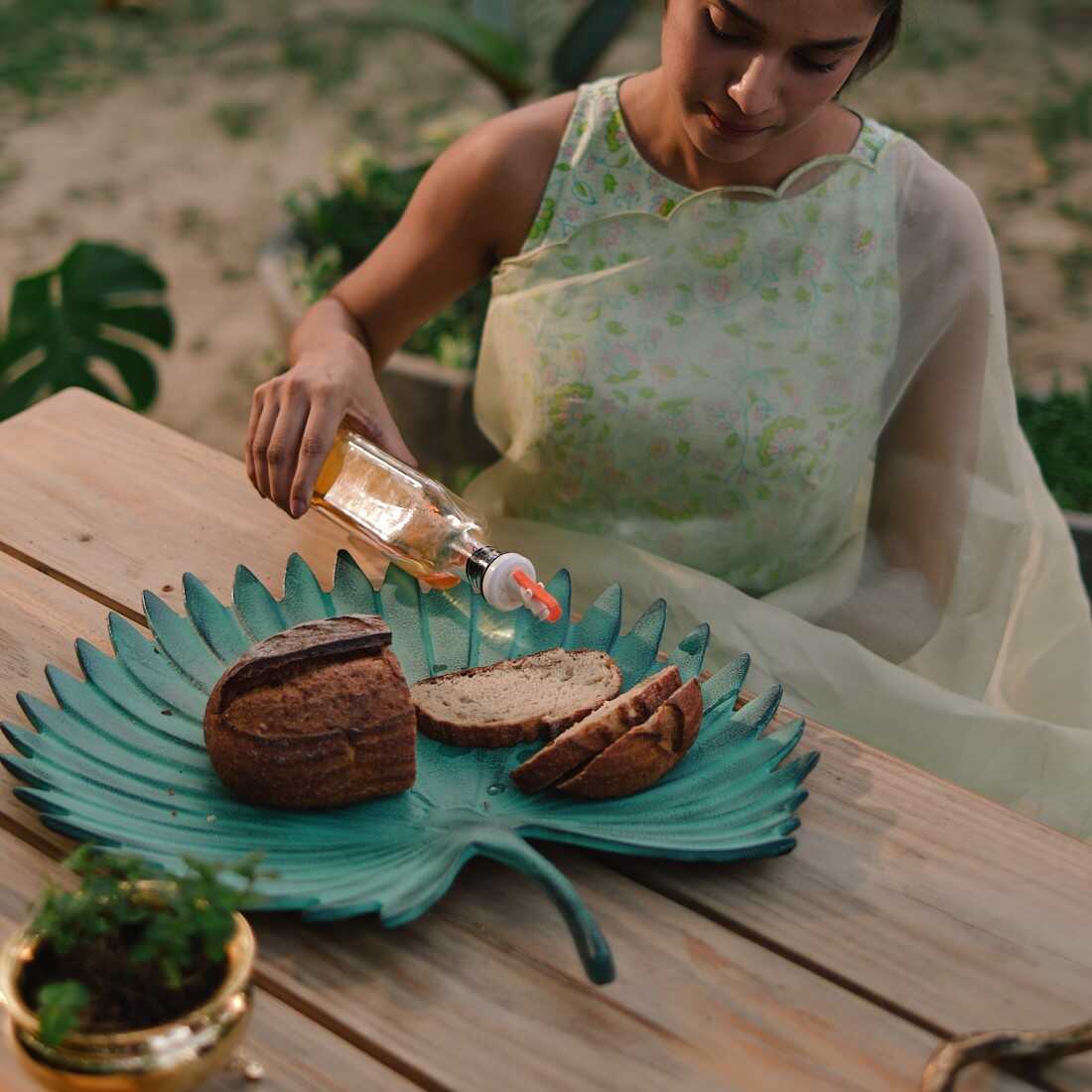 A multi use product, the fan leaf can be used as a platter or a sculpture in your balcony garden.