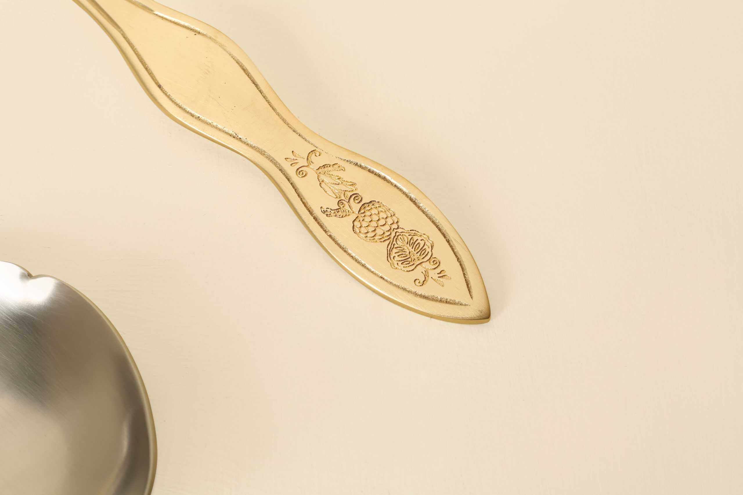 A rice & vegetables serving set. Comes with a gorgeous sitaphal mirchi illustration. Designed for Indian food, crafted in pure brass.