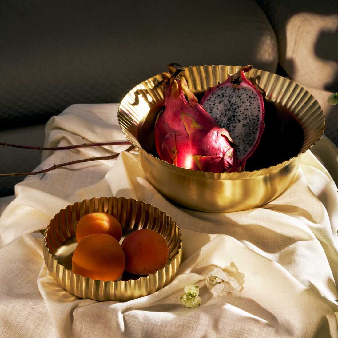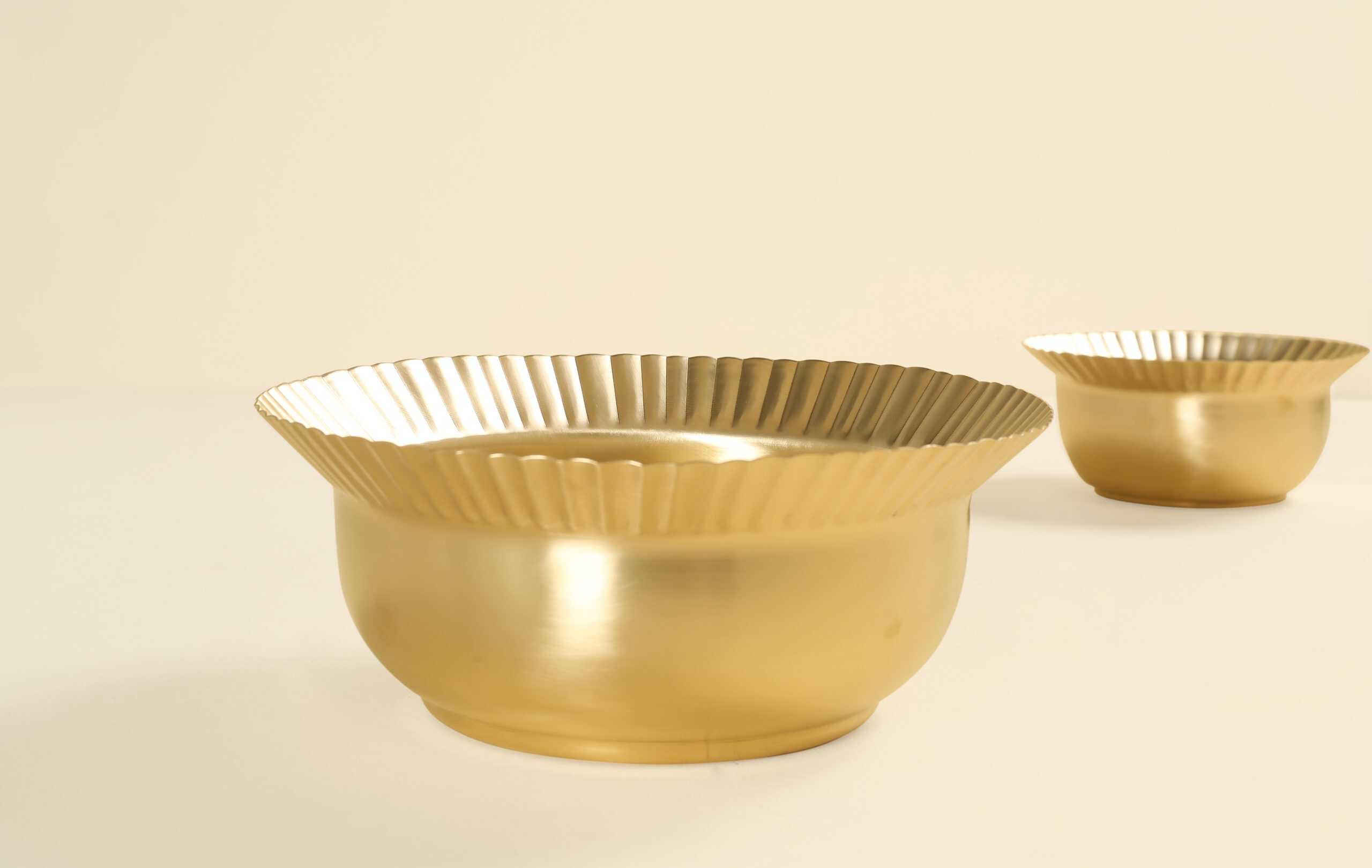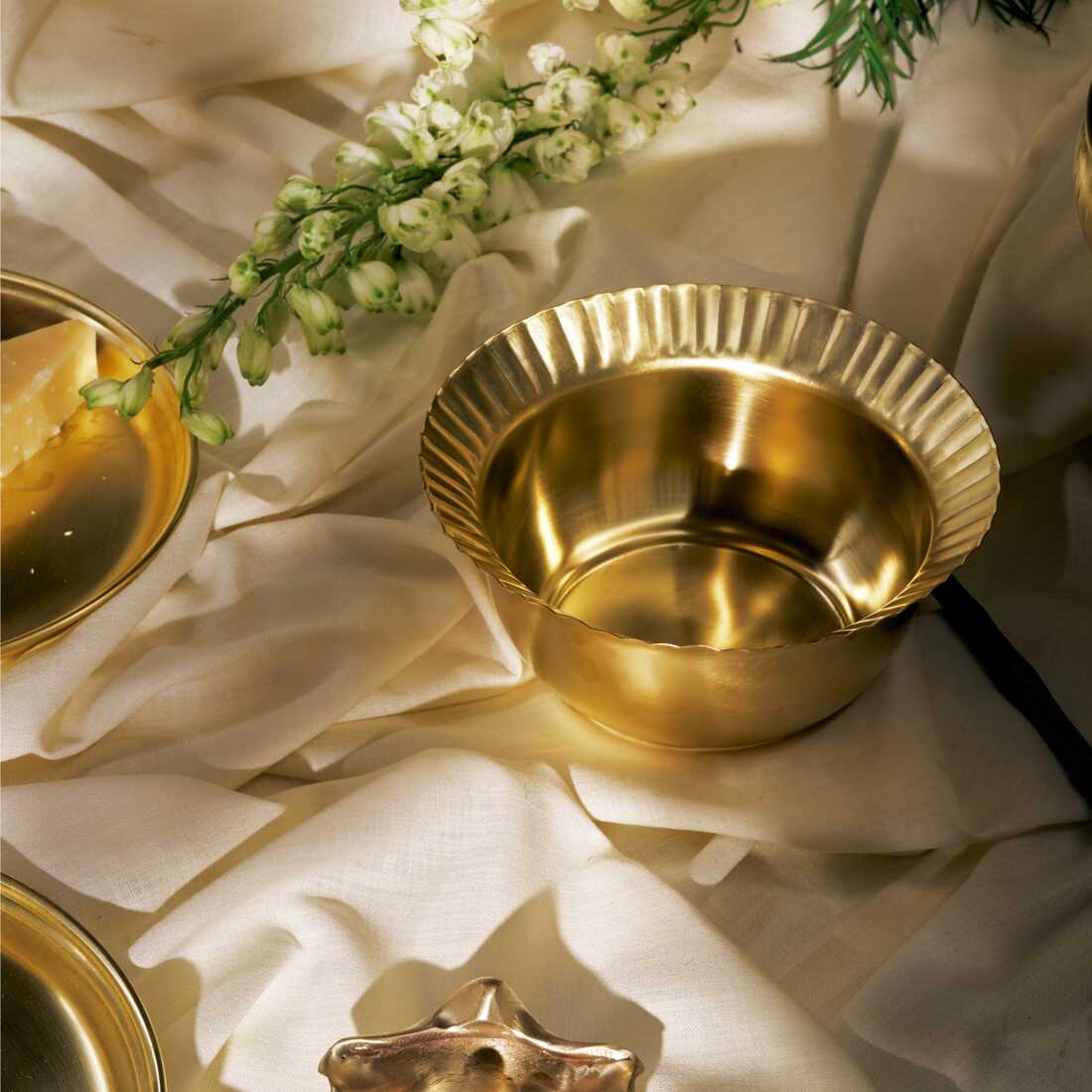 Whip up your favourite delicacies & serve your lavish spread in these brass bowls. The border detailing is bound to make it sparkle on the table. Ideal to serve dry vegetables.